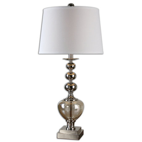 Лампа настольная с бежевым абажуромТатьяна НинуаЛампа выгладит очень нежно. Прозрачная стеклянная ножка под хрусталь на основании из металла. Сколы, царапины отсутствуют. Светло бежевый абажур. Цвет соответствует фото.